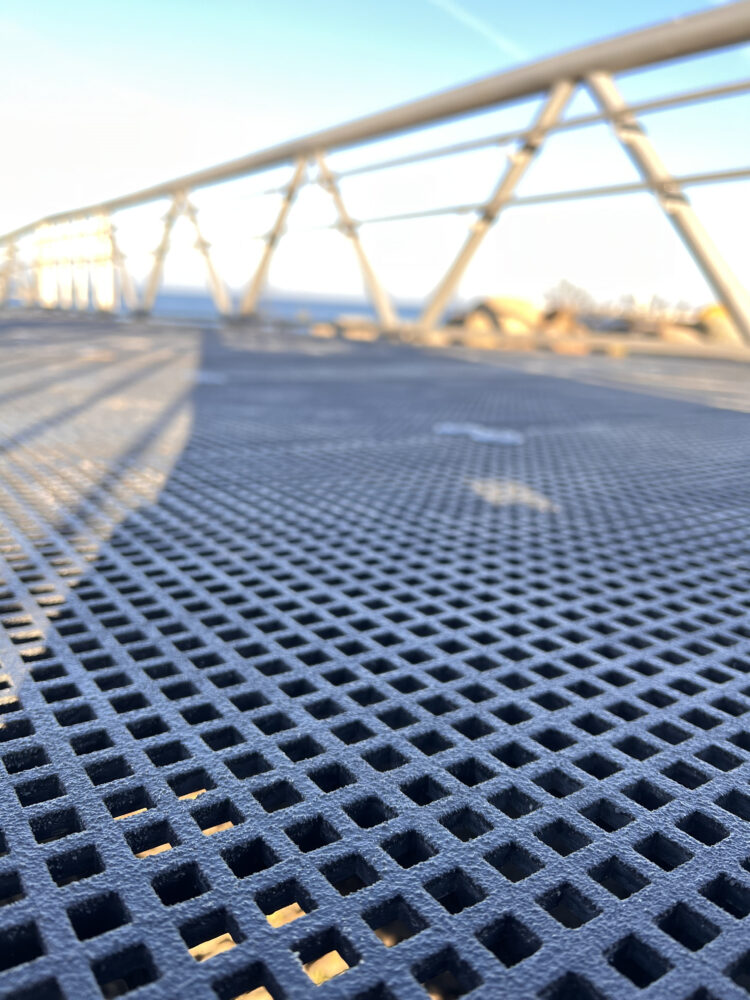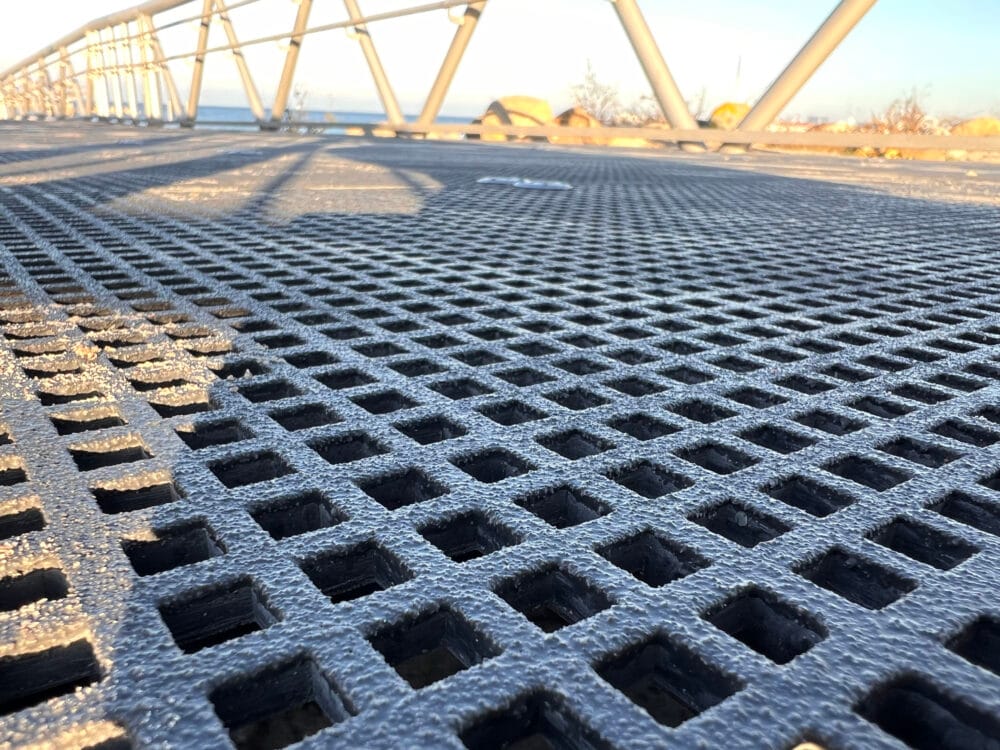 Glasfiber er et materiale, der forener det bedste fra flere verdener. Hvor træ risikerer at rådne, og stål angribes af rust, tåler glasfibergitteret både saltstænk, sol og konstant belastning. Det er lige sikkert under bare fødder på en varm sommerdag som under kørestolshjul på en blæsende efterårsdag. Og takket være, at det både er let og stærkt, er det nemt at montere, samtidig med at det kan bære stor belastning år efter år.