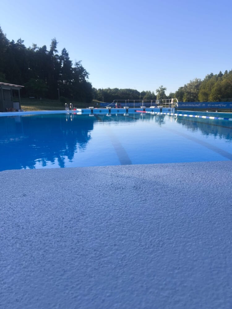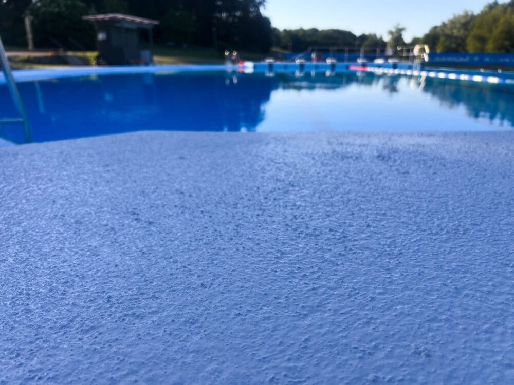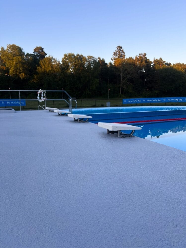 I netop dette tilfælde var det også et økonomisk spørgsmål. Det glatte gulv omkring de tre bassiner var allerede behandlet med en epoxymaling, hvilket havde en vis positiv effekt på overfladen. Men allerede efter én sæson var behandlingen blevet forringet, og efter tredje sæson var gulvet lige så glat som før. Det betød, at behandlingen skulle gentages mindst hvert tredje år. Resultatet? Omkostningsfuldt.