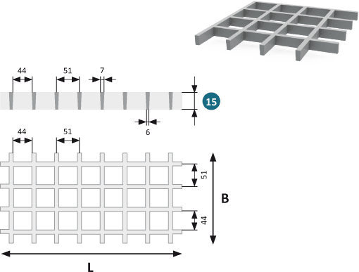 GRP gallerrist 15 med maske 51×51 mm (indvendigt 44×44 mm) er en let og omkostningseffektiv gallerrist fremstillet i glasfiberarmeret plast (GRP). Med sin lave profil på 15 mm og åbne struktur giver den god dræning og ventilation, hvilket gør den velegnet til tørre eller moderat fugtige miljøer, hvor høj bæreevne ikke er det primære krav.