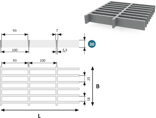GRP Gitterrist 30 med maskestørrelse 100×25 mm (indvendigt 93×18 mm) og en profilhøjde på 30 mm er en kraftig og dræningsoptimeret gitterrist fremstillet i glasfiberforstærket plast (GRP). Den langsmalle maskestruktur gør den særligt effektiv i miljøer, hvor hurtig afledning af vand er vigtig, samtidig med at højden giver god bæreevne selv under belastning.