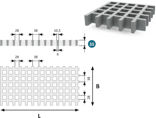 GRP Gitterrist 35 Heavy Duty er en ekstra kraftig gitterrist i glasfiberforstærket plast (GRP), udviklet til at kunne tåle meget høje belastninger i krævende og aggressive miljøer. Med en højde på 35 mm og maskestørrelse 38×38 mm (28×28 mm indvendigt) kombinerer den høj bæreevne med effektiv vandafledning og lang levetid – helt uden behov for vedligeholdelse.