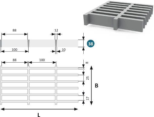 GRP gitterrist 38 med maske 100×25 mm (88×17 mm indvendigt) og en højde på 38 mm er en stærk og dræningsoptimeret gitterrist i glasfiberarmeret plast (GRP). Den langsmalle maskestruktur giver meget god afvanding, mens den høje profil sikrer fremragende bæreevne og stabilitet selv ved høje belastninger.