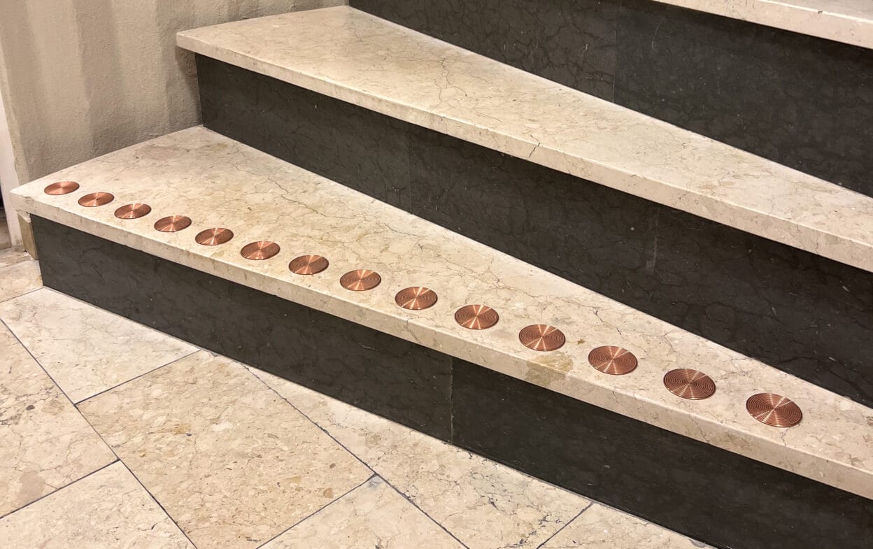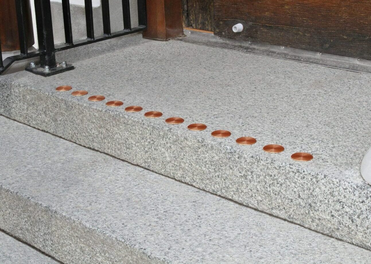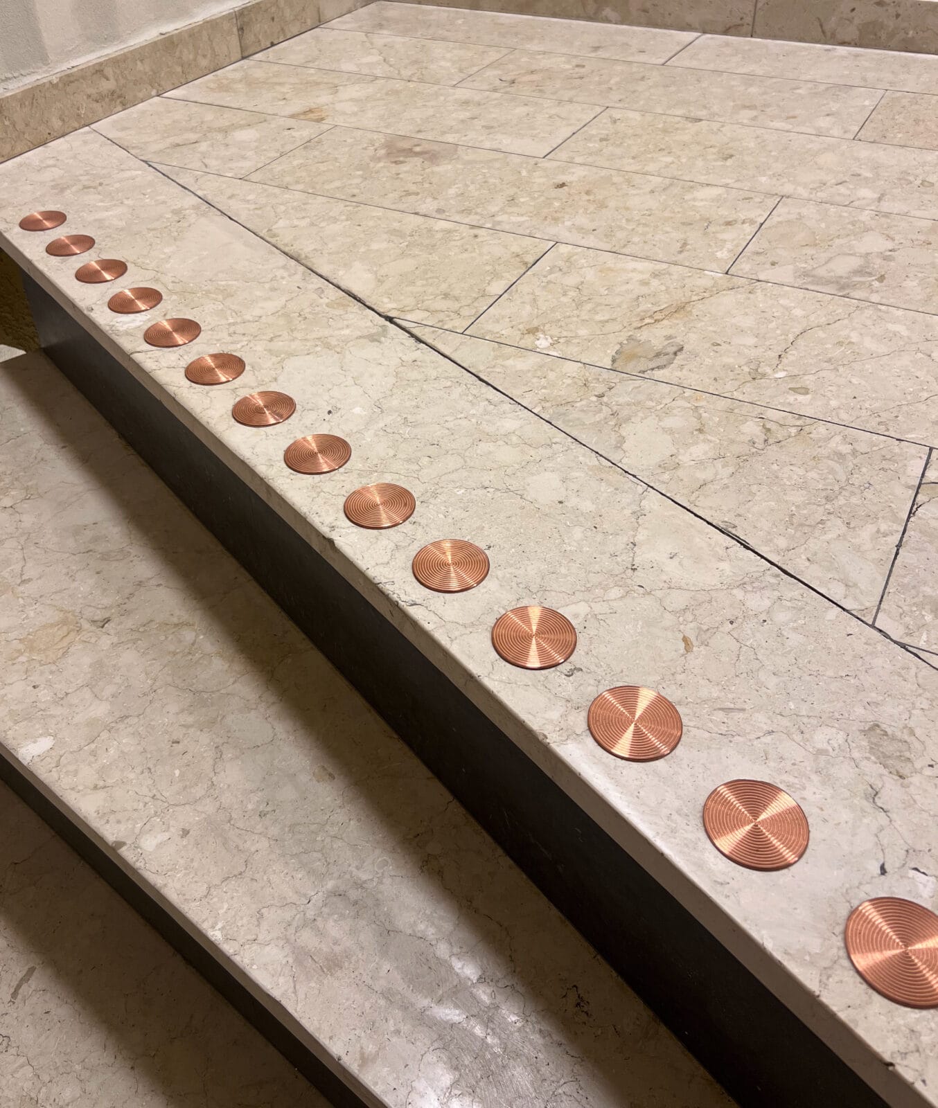 Safestep ÖVRE SLOTTS – kontrastmarkering i kobber til markering af gulve, trapper og gangarealer, indendørs og udendørs. Slidstærke og eksklusive markeringer med linjeopdelt overflade for ekstra struktur og tydelighed. Kobbermarkeringerne fås med fire forskellige bagsider for nem og holdbar montering på træ, sten, beton, tekstilmåtter og plastgulve. Vælg mellem glat bagside, skruehuller, tappe eller dobbeltklæbende 3M-tape.