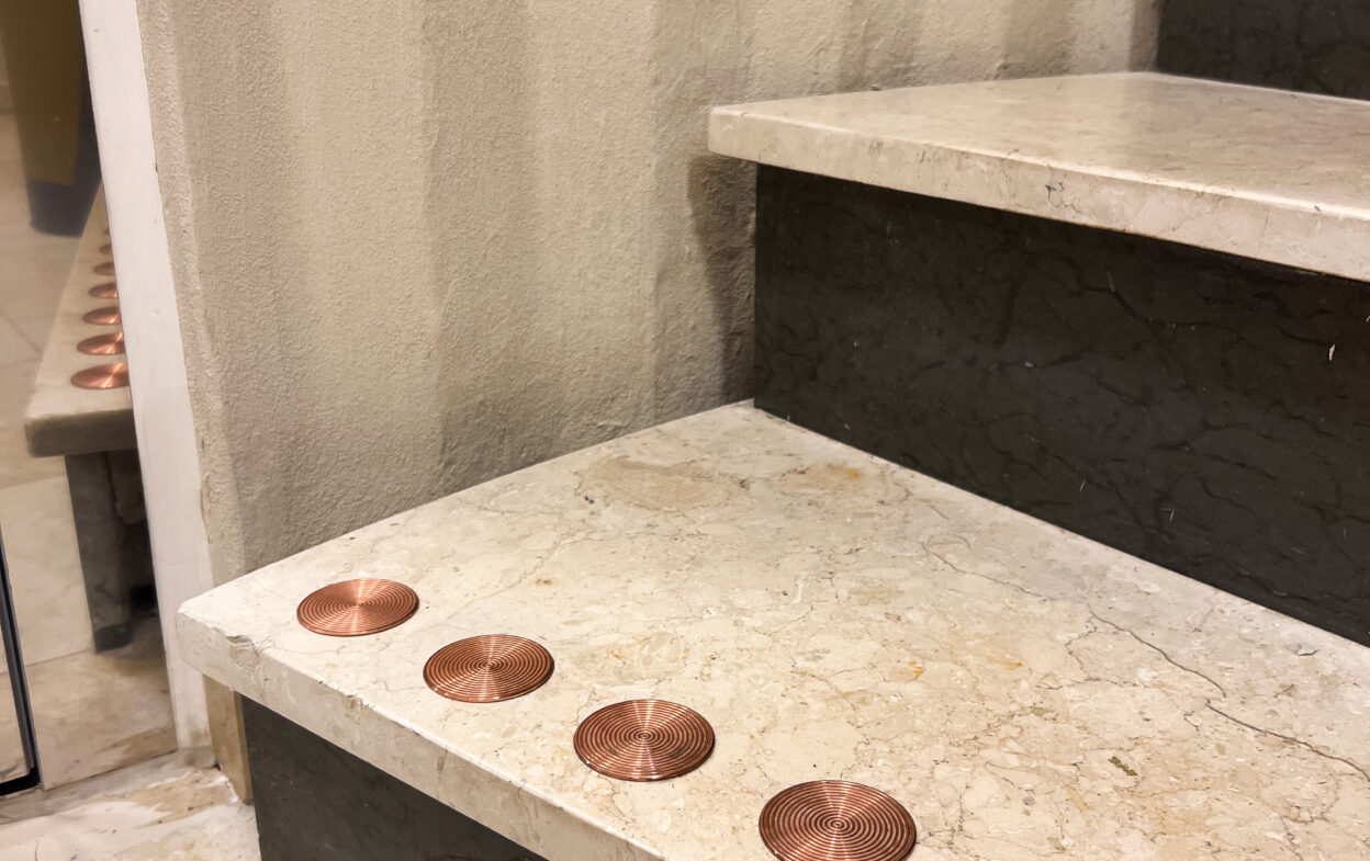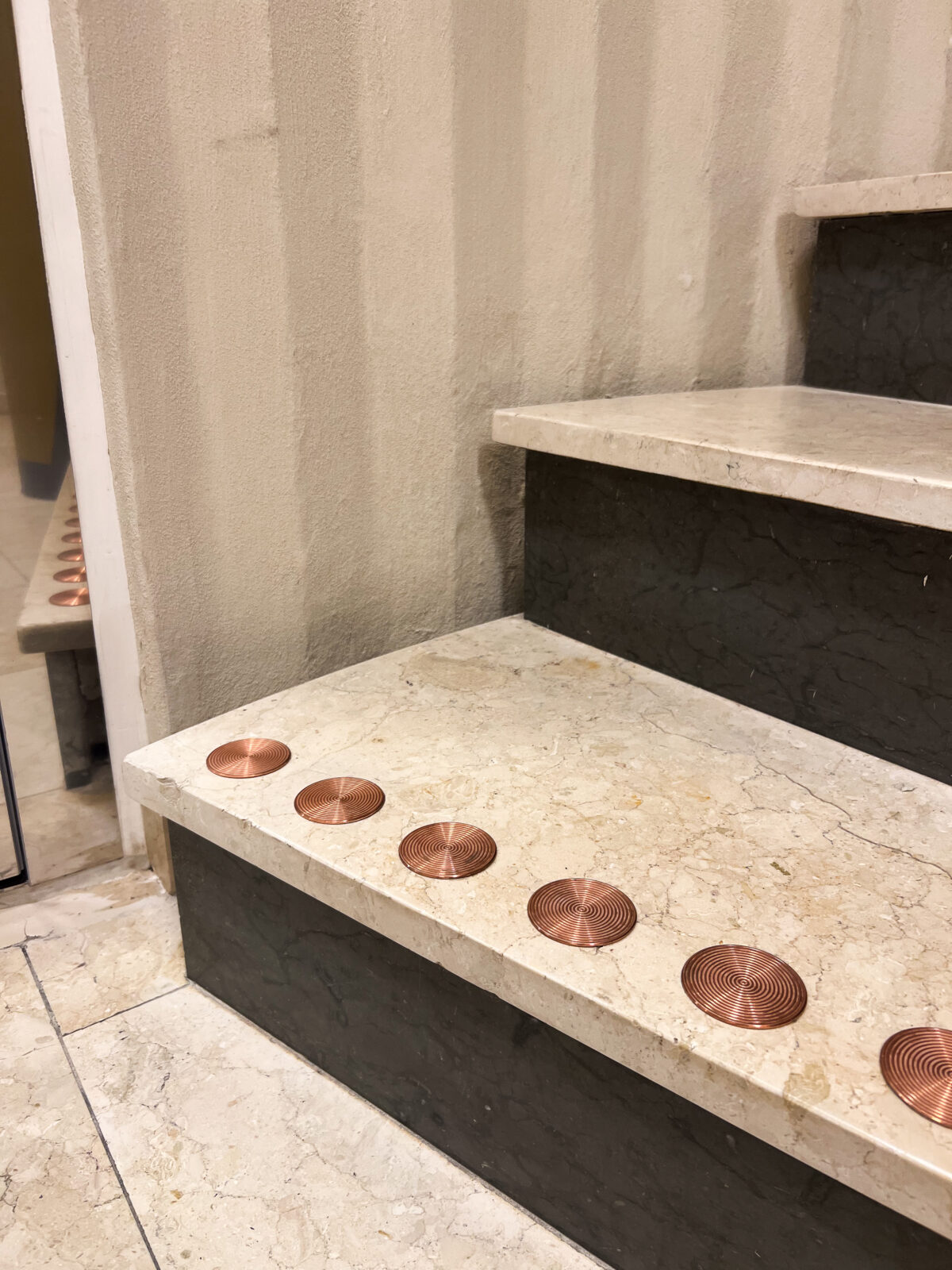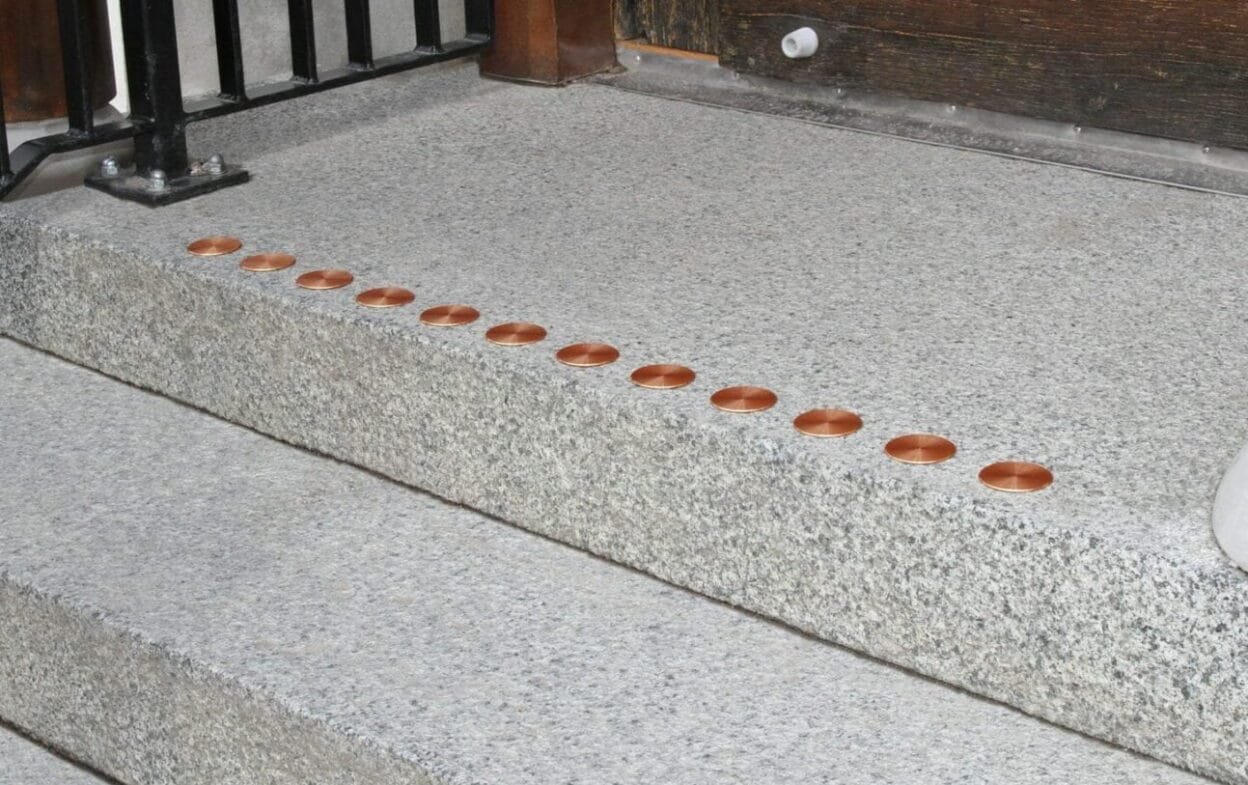 Safestep ÖVRE SLOTTS – kontrastmarkering i kobber til markering af gulve, trapper og gangarealer, indendørs og udendørs. Slidstærke og eksklusive markeringer med linjeopdelt overflade for ekstra struktur og tydelighed. Kobbermarkeringerne fås med fire forskellige bagsider for nem og holdbar montering på træ, sten, beton, tekstilmåtter og plastgulve. Vælg mellem glat bagside, skruehuller, tappe eller dobbeltklæbende 3M-tape.