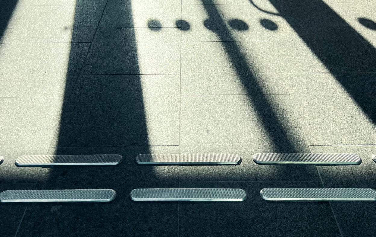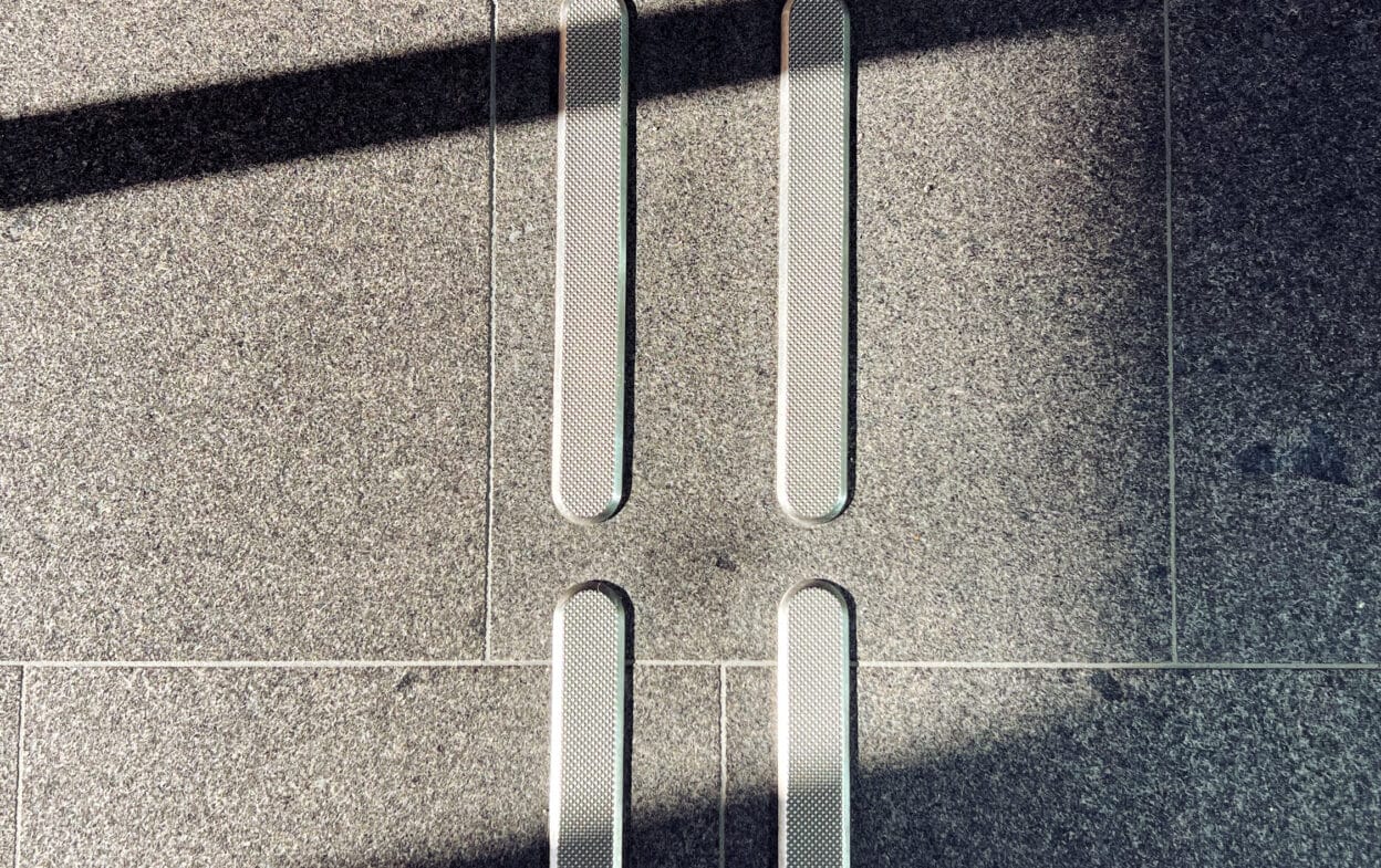 De taktile pejlemærker bør også installeres med forskellige materialer og en lysstyrkekontrast på mindst 0,4 NCS – enten lysere eller mørkere end omgivelserne. Læs mere om alle regler og anbefalinger for taktil skiltning her – eller download vores guide nedenfor under Dokumenter.