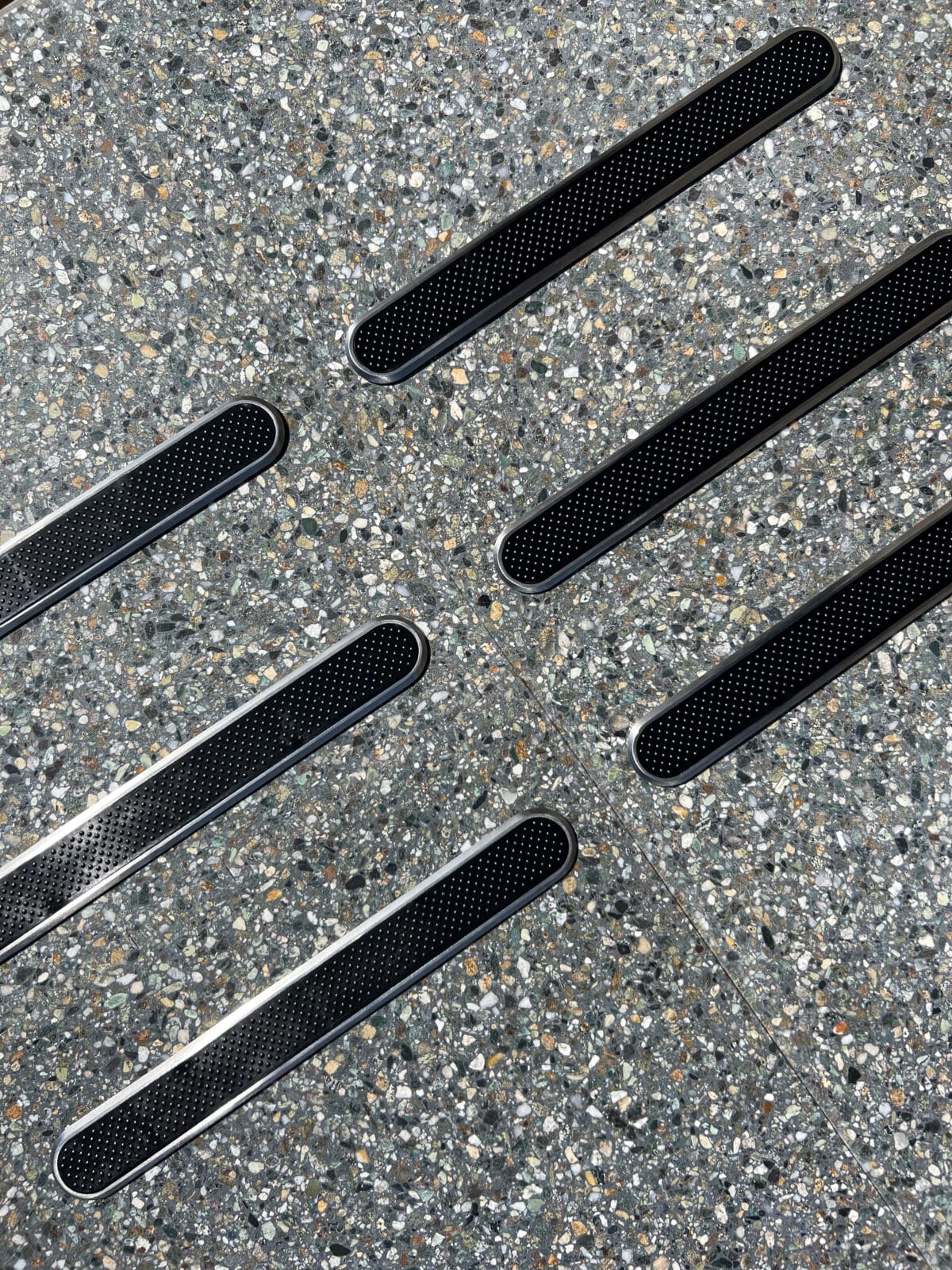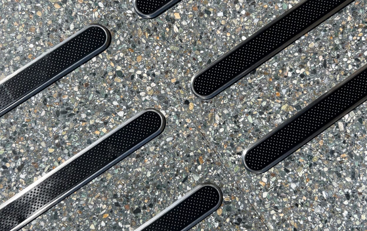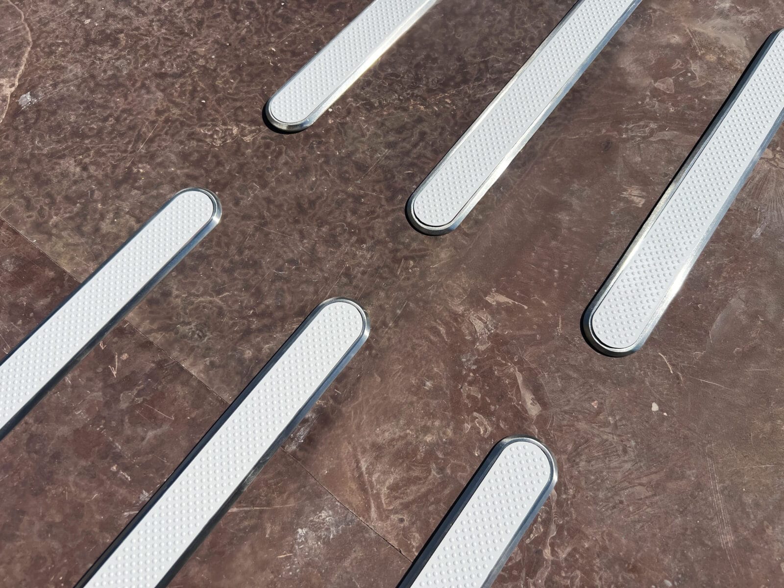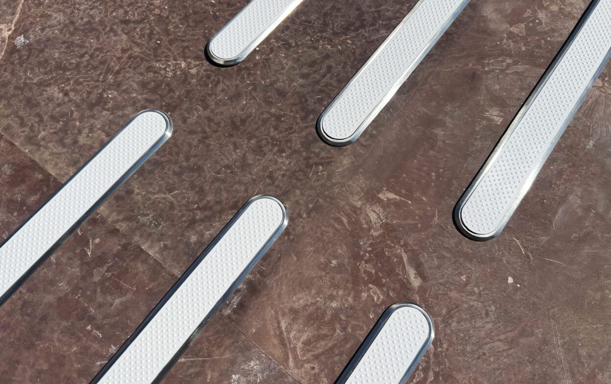 Safestep KÅBO er vores produktserie i rustfrit stål med farvede indlæg i polyuretan. Serien omfatter taktille ledestænger, stopmarkeringer og kontrastmarkeringer i forskellige farver og fastgørelser.