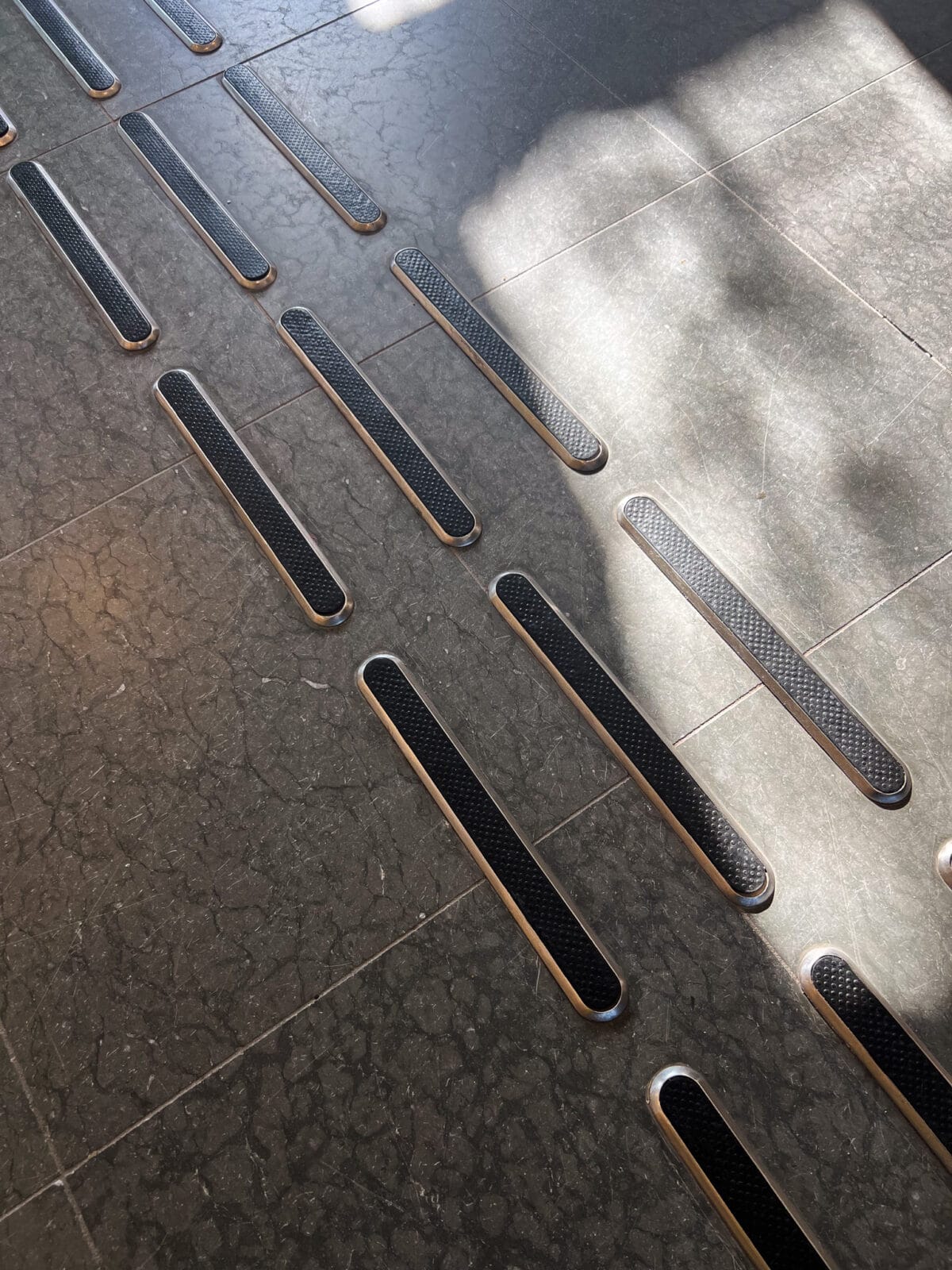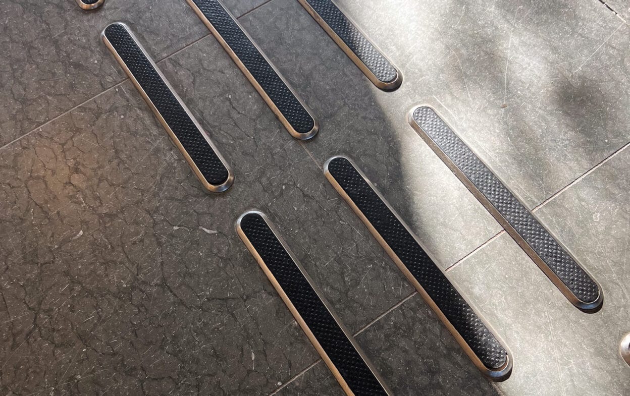 De taktile pejlemærker bør også installeres med forskellige materialer og en lyshedskontrast på mindst 0,4 NCS – enten lysere eller mørkere end omgivelserne. Læs mere om alle regler og anbefalinger for taktil skiltning her – eller download vores guide nedenfor under Dokumenter.