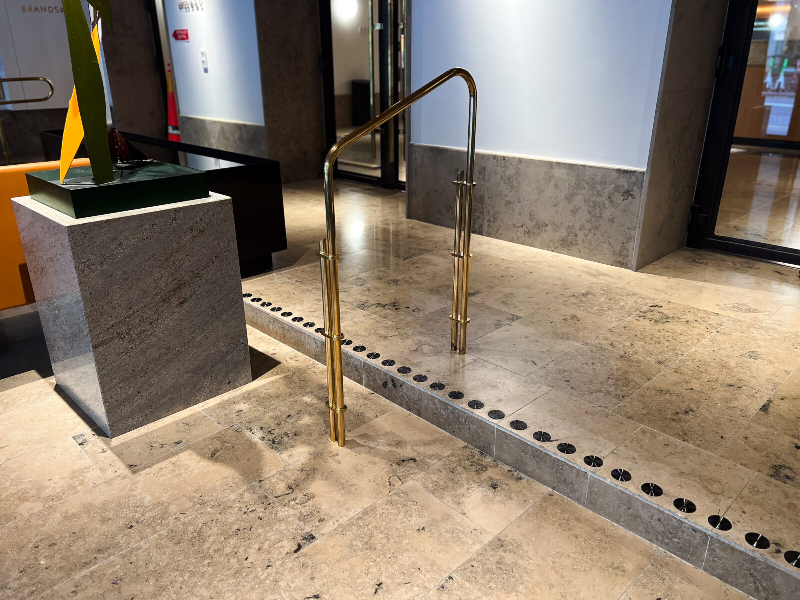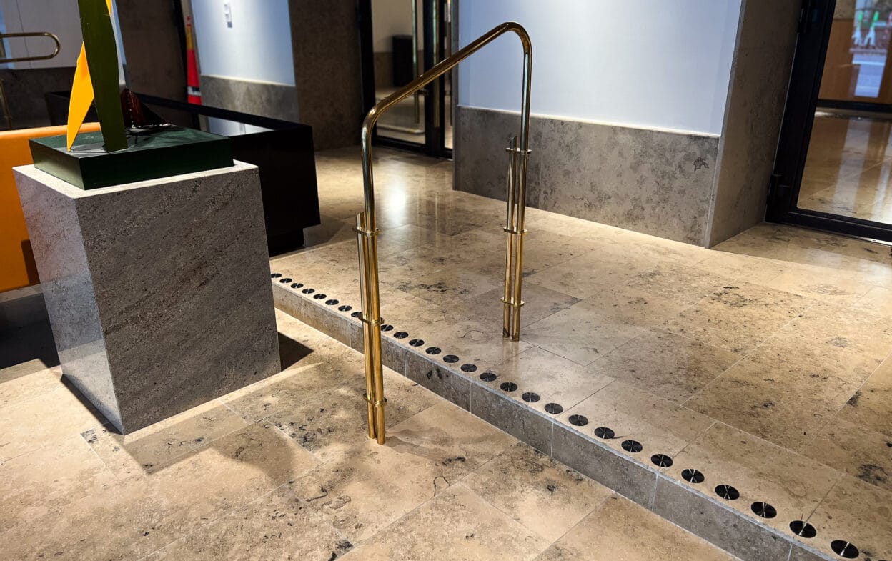 Stål med PVD-belægning er et slidstærkt, vejrbestandigt og vedligeholdelsesfrit alternativ, som egner sig godt i områder med høj trafik – både udendørs og indendørs. Den mørke belægning giver et unikt og markant udtryk og passer perfekt på lysere underlag. En indretningsdetalje, der gør det lettere for synshæmmede.
